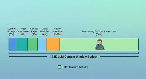 A single mid-sized React component with TypeScript types and inline comments can run 800–1,200 tokens. Add a service layer file, a few utility modules, a Notion spec doc, and a system prompt, and you've burned 30–40K tokens before you've even described what you want the LLM to do.